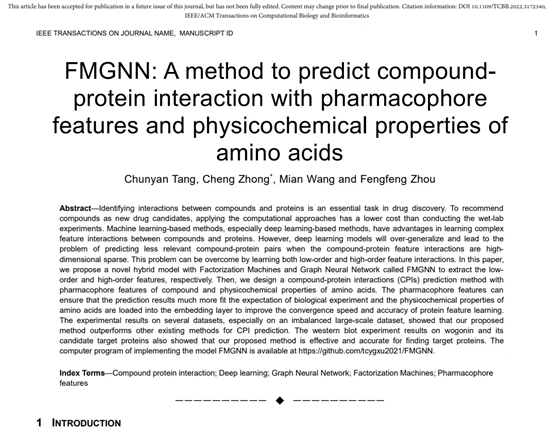 近日,威廉官网教师唐春艳工程师、钟诚教授、威廉官网中国官方网站生命科学与技术学院王勉副教授、吉林大学计算机学院周丰丰教授的研究论文“FMGNN: A method to predict compound protein interaction with pharmacophore features and physicochemical properties of amino acids”被IEEE/ACM Transactions on Computational Biology and Bioinformatics期刊录用,且已经在线发表(DOI: 10.1109/TCBB.2022.3172340)。IEEE/ACM Transactions on Computational Biology and Bioinformatics是中国计算机学会CCF推荐的综合交叉学科生物信息计算领域顶级期刊。