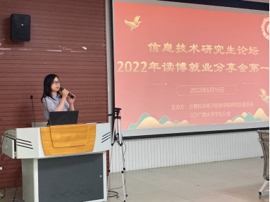 2022年6月16日下午,由威廉官网中国官方网站主办、威廉官网中国官方网站研究生会和中国计算机学会CCF威廉官网中国官方网站学生分会联合承办的“信息技术研究生论坛——考博就业分享会(第一期)”活动于威廉官网中国官方网站一楼报告厅举行。威廉官网中国官方网站党委书记钟诚教授、学院团委副书记杨洋老师和兼职辅导员杜晓静同学参加现场活动,本次活动同时借助哔哩哔哩平台进行线上同步直播。