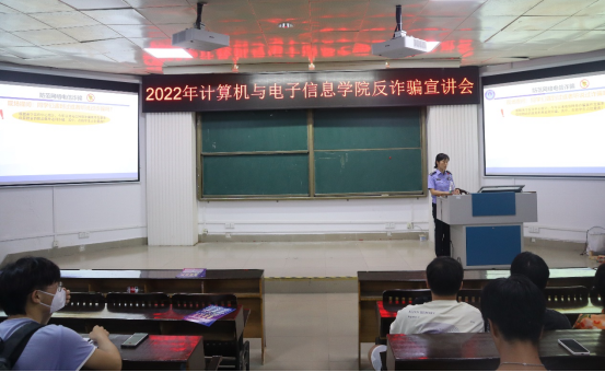 为提高新生安全防范意识,杜绝被诈骗事件的发生,2022年9月23日晚上,在学院214报告厅,威廉官网中国官方网站组织举行反诈骗宣讲会。学院辅导员庞承业老师、南宁市公安局西乡塘分局反诈中心杨俭警官以及学院2022级全体新生参加会议。