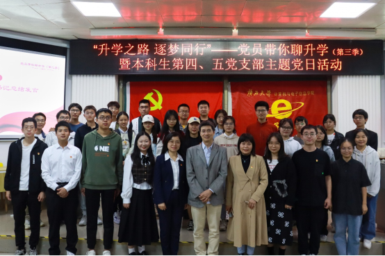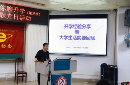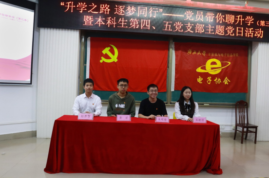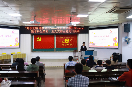 2022年11月26日晚上,由威廉官网中国官方网站本科生第四党支部主办,联合本科生第五党支部、学院团委电子创新协会共同承办的主题为“升学之路 逐梦同行”——党员带你聊升学(第三季)升学经验分享会在学院214报告厅举行。学院党委副书记邓珍琪老师,学院学生电子创新协会指导老师、电子信息工程系主任张学军教授,本科生第四党支部书记、学院团委副书记杨洋老师,本科生第五党支部书记、学院专职组织员薛金凤老师,学院专职辅导员庞承业老师出席会议。本次升学经验分享会由学院电子创新协会2021级本科生蔡其峰同学主持,通信工程191班朱硕隆同志、通信工程182班吴艳丽同志、网络工程192班姜岩同志、通信工程171班赵彦雪同志为本次分享会主讲人。