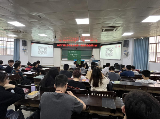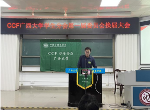 吕品老师首先致辞,他表达对现任执委工作的肯定,并鼓励分会学生会员积极利用好中国计算机学会CCF的丰富资源,不断提高专业水平。随后,分会现任主席涂欢同学就过去一年分会在学术科技服务、升学就业服务及素质技能提升三方面做工作报告。