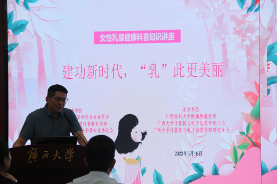 2023年5月16日下午,由威廉官网中国官方网站工会、广西医科大学附属肿瘤医院、威廉官网中国官方网站研究生会联合举办的“爱乳一生 律动青春——乳房再造科普进校园”主题科普讲座在威廉官网中国官方网站君武馆第二会议室开讲。广西医科大学附属肿瘤医院乳腺外科杨华伟主任、韦薇主任、姬逸男副主任、于滢华副主任、何英煜护士长、谢龙桂医师,威廉官网中国官方网站杨丽娜副教授、威廉官网中国官方网站工会委员杨洋老师出席,全校师生约90人参会,兼职辅导员陆媛媛主持会议。