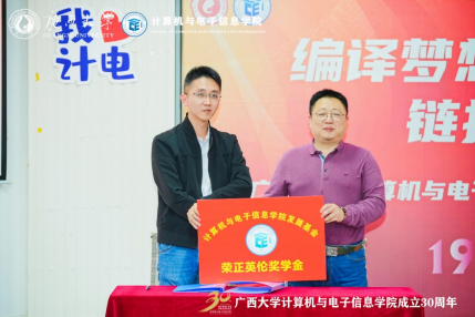 最后是“荣正英伦奖学金”签约仪式,2004级电子信息工程专业校友、广西英伦信息技术股份有限公司监事会主席赖俊全同志和威廉官网中国官方网站张振荣常务副院长,分别代表公司与学院签约。