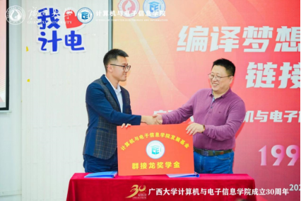 接着进行“群接龙奖学金”签约仪式,2008级计算机科学与技术专业校友、广西尚食科技有限公司项目经理王志明同志和威廉官网中国官方网站张振荣常务副院长,分别代表公司与学院签约。
