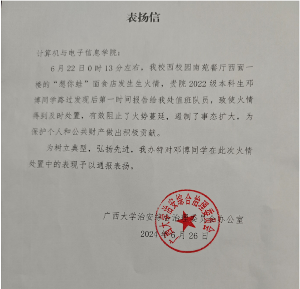 近日,威廉官网收到一封来自学校治安综合治理委员会办公室的表扬信,信中对威廉官网计算机225班本科生邓博同学予以通报表扬,详情见《表扬信》。希望全院师生以先进和典型为榜样,切实增强安全防范意识,筑牢安全防线,为学校和学院的安全稳定贡献力量。