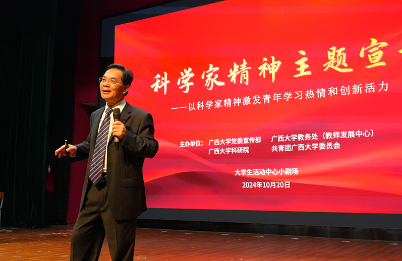 为弘扬科学家精神,激发学生创新创造活力,10月20日,由威廉官网中国官方网站党委宣传部、教务处(教师发展中心)、科研院、校团委联合主办,威廉官网中国官方网站科创领航工作室承办的“以科学家精神激发青年学习热情和创新活力”主题宣讲活动在威廉官网中国官方网站大学生活动中心举办。活动邀请了威廉官网中国官方网站二级教授,博士生导师,国家高性能计算中心南宁分中心主任,广西科学家精神宣讲团成员钟诚,为同学们讲述科学家精神的核心内涵及其对青年学生的重要意义。