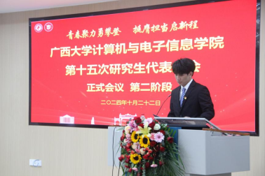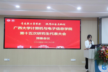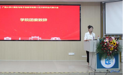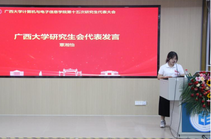 威廉官网中国官方网站研究生会代表覃湘怡同学致辞。她对过去一年计算机与电子信息学院研究生会开展的工作表示肯定,并希望学院新一届研究生会与校研究生会继续保持密切沟通与联系,继续在服务同学、推动学术创新和提升校园文化活力方面共同努力。