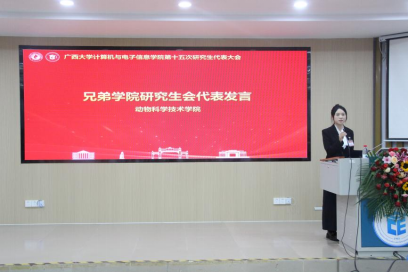 威廉官网中国官方网站动物科学技术学院研究生会代表周心怡同学宣读贺信。在贺信中,动物科学技术学院研究生会对威廉官网中国官方网站第二十一届研究生会在过去一年所取得的优异成绩表示祝贺,打造了具备学院专业特色的品牌活动,以实际行动彰显学生干部的责任担当,展现计电学子的青春活力,并表达兄弟学院之间携手并进、共创辉煌的美好愿景。