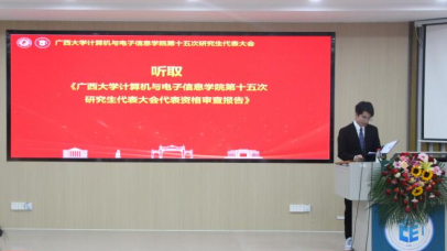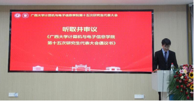 学院第二十一届研究生会主席团成员甘行辉同学宣读《威廉官网中国官方网站第十五次研究生代表大会倡议书》,与会代表认真聆听、细致审议,一致表决通过倡议书。