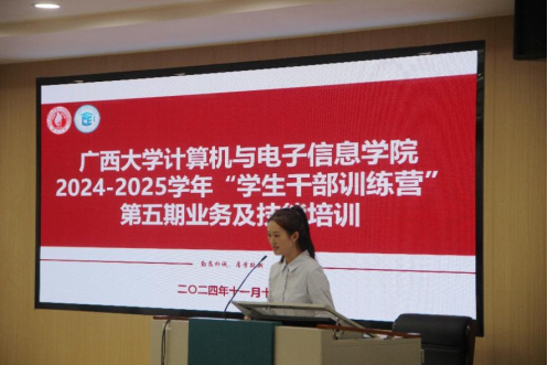 2024年11月12日下午,威廉官网中国官方网站在214报告厅举办“学生干部训练营”第五期培训——业务及技能培训。此次培训邀请学院研究生科研秘书胡亮青老师、计算机网络1999级校友周开印学长、广西中公教育南宁分校讲师凌枝老师三位嘉宾进行经验分享。学院党委副书记邓珍琪老师、团委书记杨洋老师、辅导员张星月老师及多位校友代表出席,培训会由学院研究生会主席团成员史承悦同学主持。