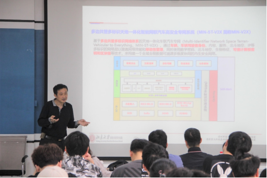 李挥教授首先介绍了由其本人主笔的报告、专利成果和书籍,及实验室团队参加竞赛获得的优异成绩。接着,李挥教授向同学们讲述了多边共管多标识天地一体化智能网联汽车高安全专网系统的例子,该系统通过车辆、车辆驾驶者身份等多标识的网络层以提高网络效能和移动性管理,同时使用可信计算根密钥和区块链等技术,构建了一个全域、全程数据可溯源多维度协同的内生安全网络,有效的保障了车联网的安全性、可靠性、兼容性以及可扩展性。随后,李挥教授介绍了IP网络的三大问题:网络主权、网络安全、网络架构,详细分析并提出了这三个问题的解决思路,并且对所提出的方法分别进行了实例展示。