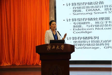 随后,华中科技大学计算机科学与技术学院院长冯丹教授为大家带来了《支持近数据处理的计算型存储技术》主题讲座。冯丹教授首先介绍近数据计算型存储技术的研究现状与进展。随着数据规模增长,数据移动导致的请求延迟增加、系统性能下降、系统整体能效降低等问题越来越严重。为此,近数据处理技术成为研究热点。随后,冯丹教授对近数据处理发展趋势做出了权威解读。计算型存储是一种基于近数据处理技术的设备,已应用在数据分析、数据压缩、文件系统、机器学习等应用领域,提升其整体效率。最后,冯丹教授分享了其团队在此领域的探索和一些实践工作,比如如何在分布式的运行存储系统中间,利用存储节点的算力来进行近数据处理,提升整体性能的研究。